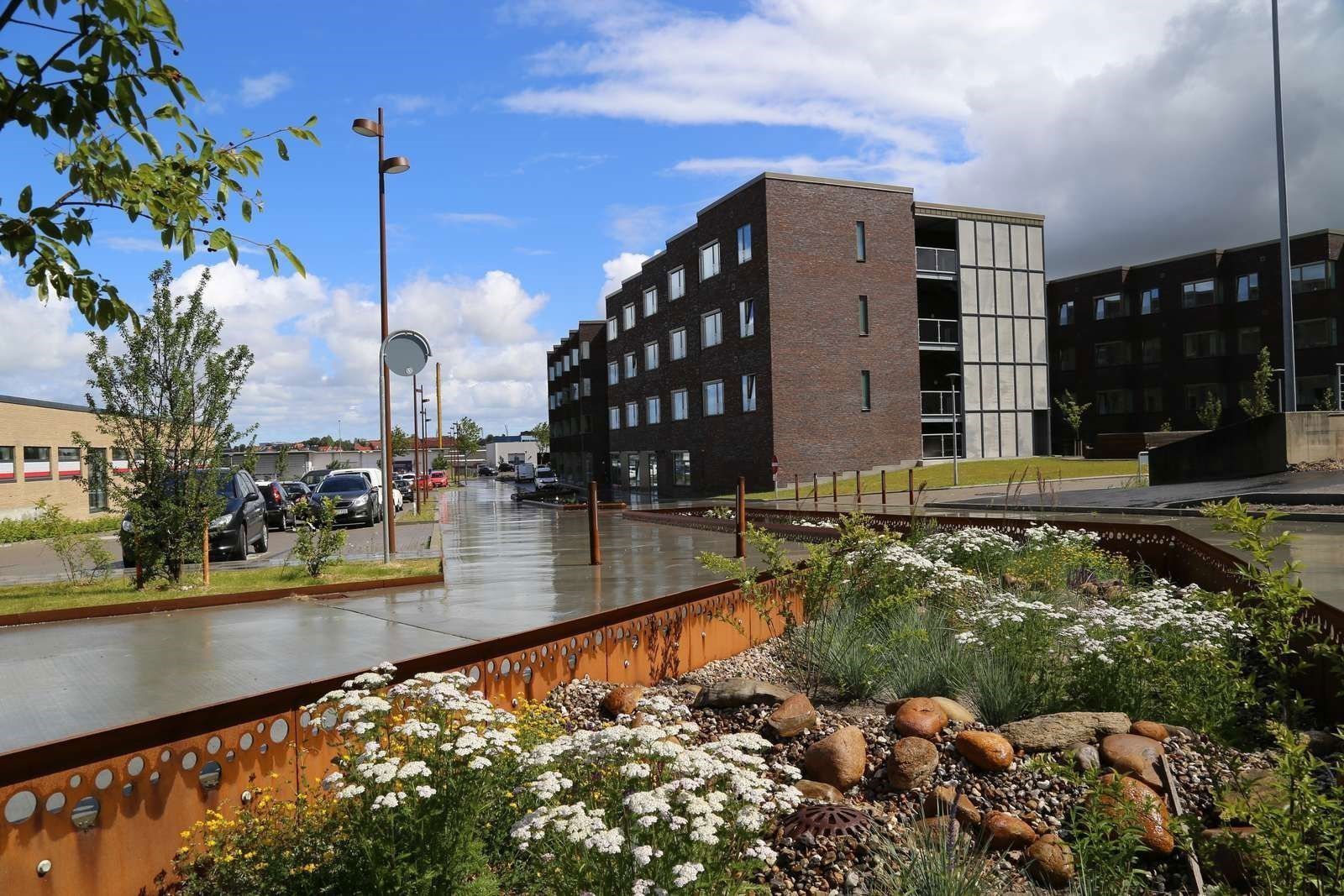 Hærvejsstien er anlagt med store lyse betonflader, træer, stauder, urter og siddemuligheder, der indbyder til ophold undervejs.
