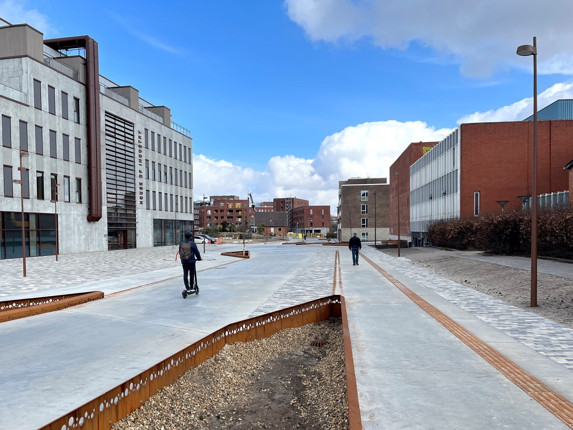 Hærvejsstien er anlagt med store lyse betonflader, træer, stauder, urter og siddemuligheder, der indbyder til ophold undervejs.