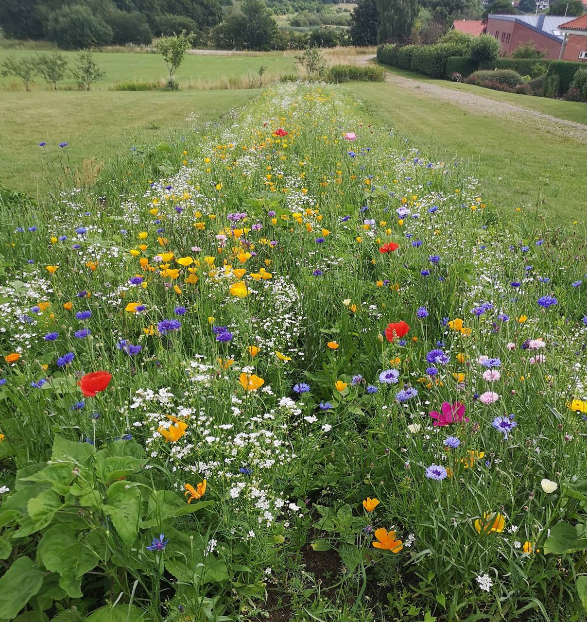 Vi giver blomsterfrøene - en vild blomstereng-blanding med mange forskellige hjemmehørende arter med både ét og flerårige urter. I skal selv betale entreprenøren for jordbearbejdningen og selve såningen.