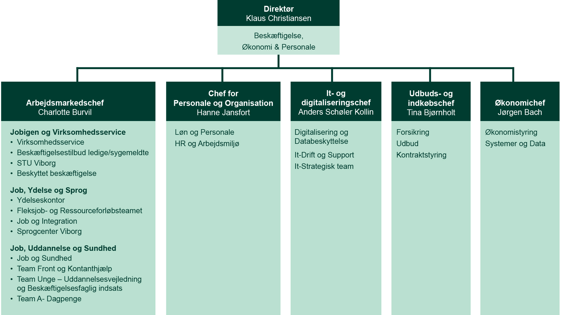 ForsideOm kommunenOrganisationBeskæftigelse, Økonomi & PersonaleOrganisationBeskæftigelse, Økonomi & PersonaleBeskæftigelse, Økonomi & PersonaleDirektørområdet arbejder med arbejdsmarked, personale og organisation, it og digitalisering, udbud og indkøb samt økonomi.senest opdateret 21. januar 2026Organisering i Beskæftigelse, Økonomi & PersonaleCharlotte Holkgaard BurvilArbejdsmarkedschef87 87 49 00cbu@viborg.dkHanne JansfortChef for Personale og Organisation93 59 80 45haja@viborg.dkAnders Schøler KollinIt- og digitaliseringschef87 87 41 50akol@viborg.dkTina Fredsgaard BjørnholtUdbuds- og Indkøbschef41 93 34 40tbj@viborg.dkJørgen BachØkonomichef87 87 89 56job@viborg.dk