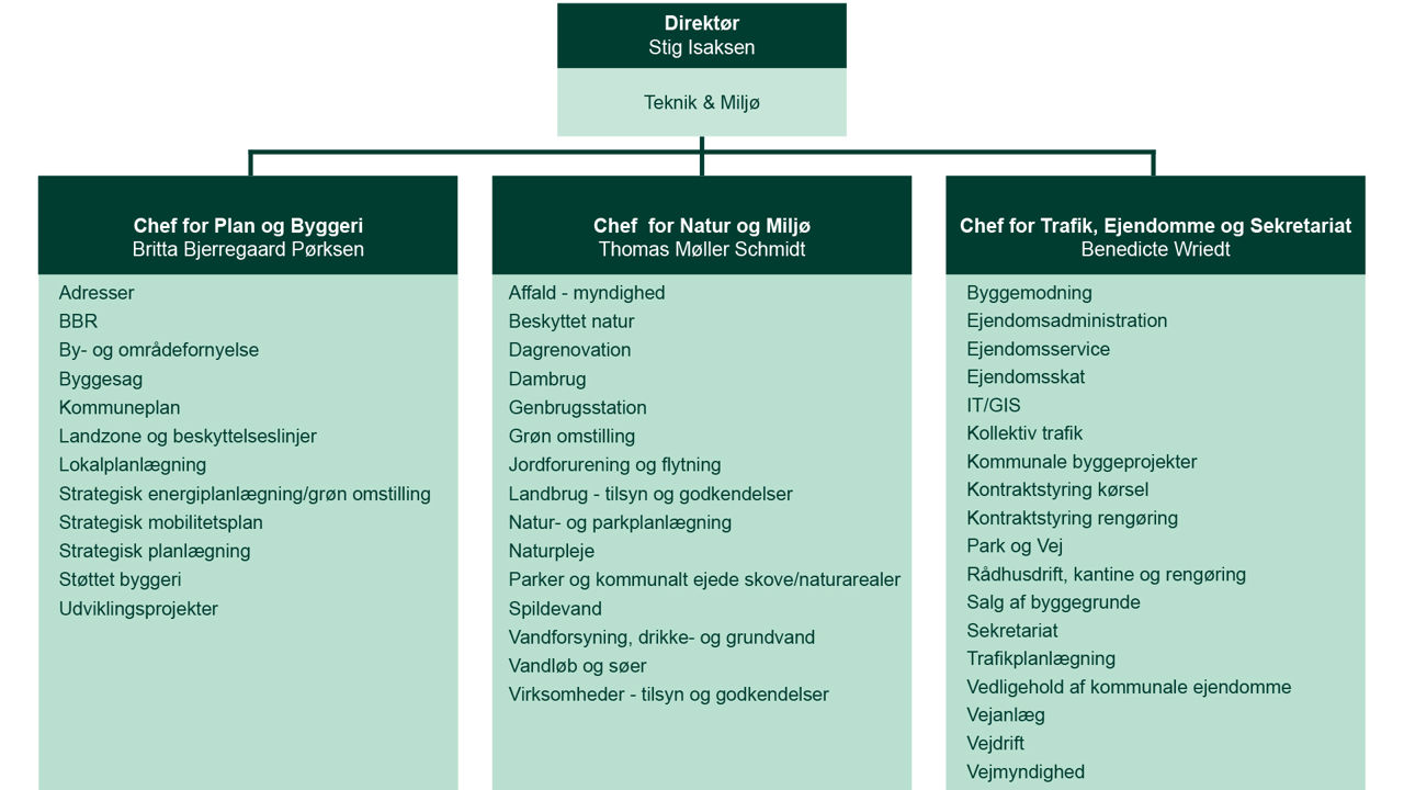 Direktørområdet arbejder blandt andet med natur og vand, trafik og veje, byggeri og miljø samt lokal- og kommuneplanlægning.