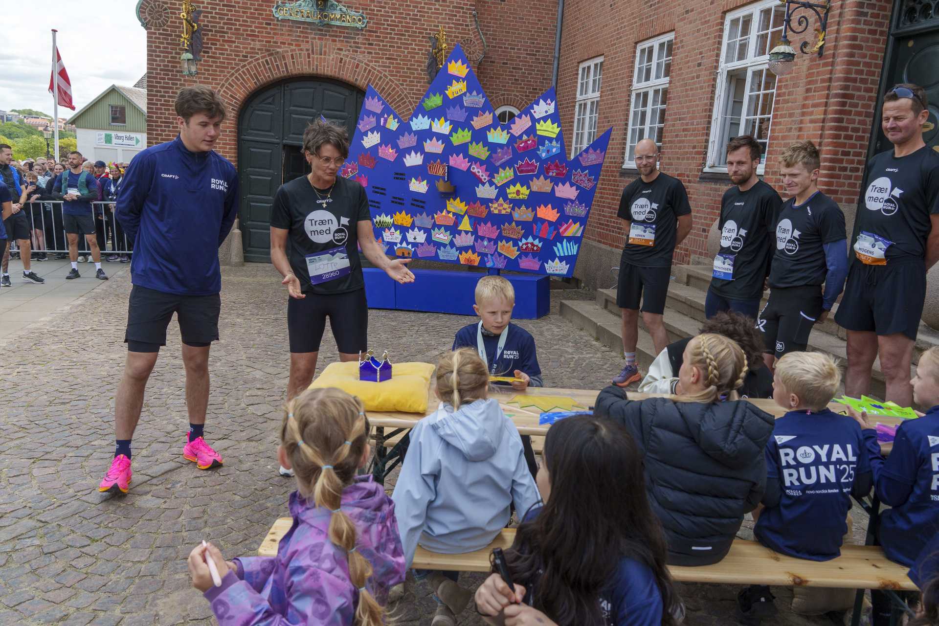 På Royal Run-dagen overrakte fem børn - et barn fra hvert af arrangementerne - deres kongekroner til H.K.H. Kronprinsen og satte dem symbolsk på en af kæmpekronerne på Sct. Leonis Torv.